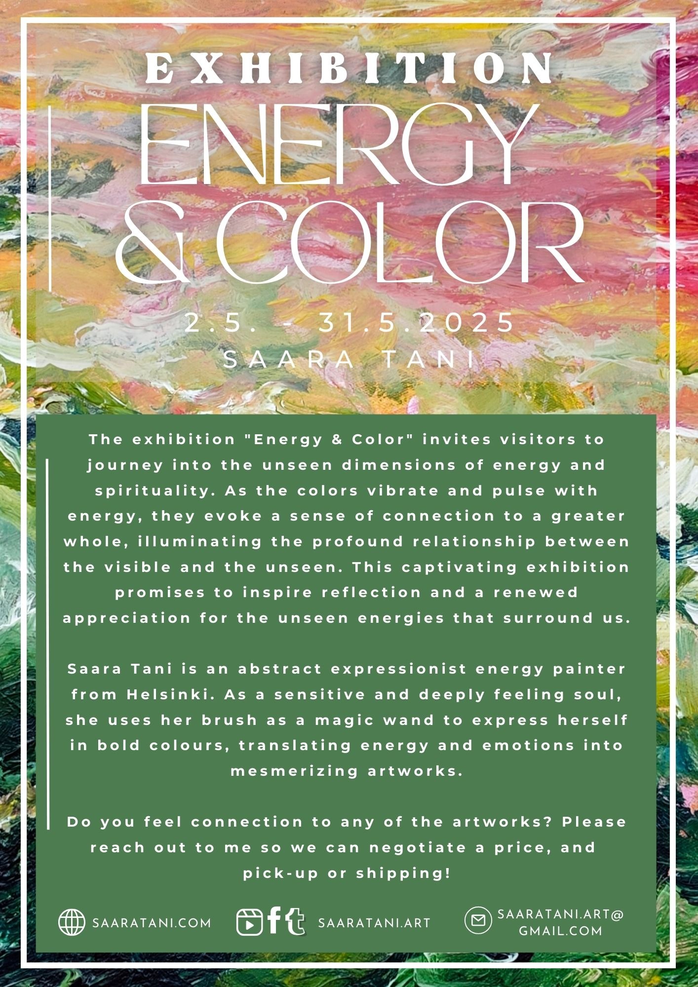 Information about my upcoming exhibition of the ever expanding collection "Energy & Color" at Galleria Salmi, Laajasalo Library, from May 2nd, 2025